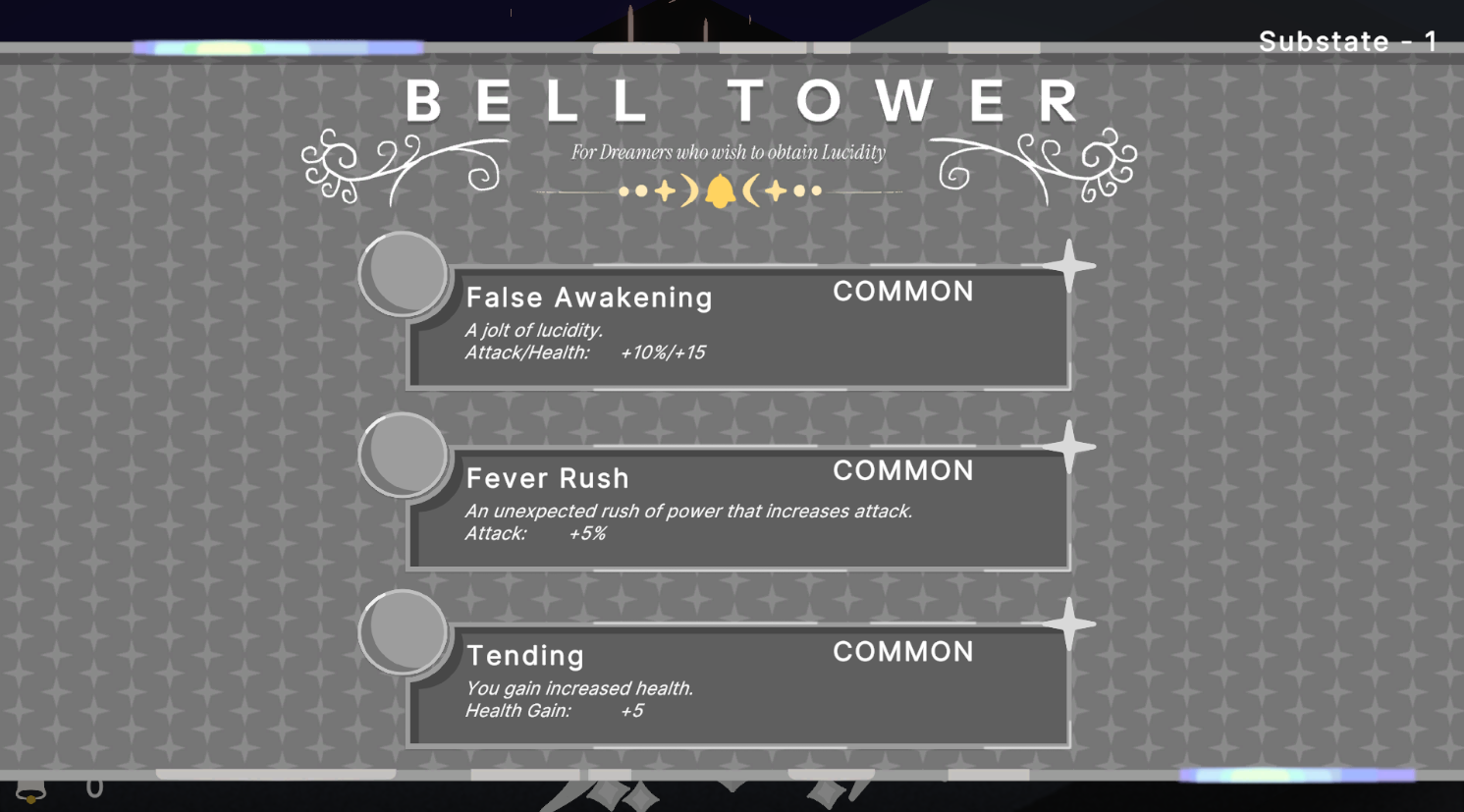 - Whenever all waves of a Substate are cleared, there will be a Bell Tower that spawns, offering upgrades to the player